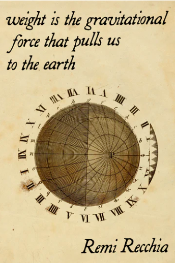 Narrated in just twelve interconnected quatrains, weight is the gravitational force that pulls us to the earth is a chapbook between dreams. The poems find the speaker located in a dreamscape much like our own world but with startling deviations: carpooling to work (with a dragon), going to the dentist (to find diamonds in one’s gum tissue), footwear accessories (bedazzled with larvae). The tone is, in turns, quippy, earnest, and lyric.